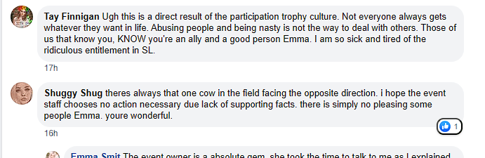 Sadly the comments on her Facebook post show that some other people just think that asking for inclusion is “entitlement” or “their needs FIRST”: