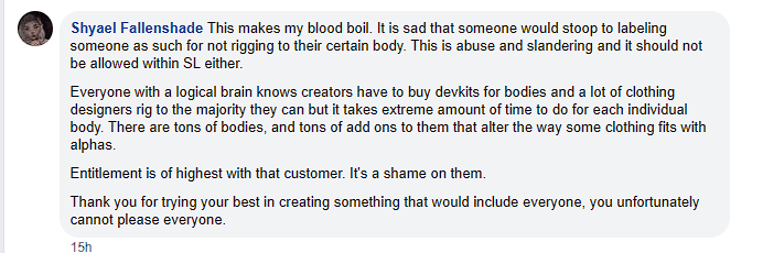 I’m not some horrible ghoul who attacked her because she wasn’t being inclusive. I am/was someone who really thinks she makes lovely clothing, changed my own avatar so I could wear it, and hoped if I asked nicely she would consider rigging for others in the community in future. It was her response – well lack of I guess seeing as she blocked me and didn’t speak to me at all – that lead me to conclude that her pride intentions were at best disingenuous or at worst that her actions were transphobic.