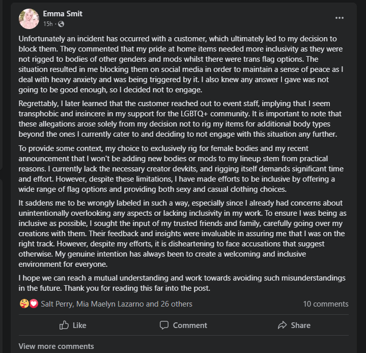 She also says that she “had concerns about unintentionally overlooking any aspect or lacking any inclusivity in my work”. But a couple of paragraphs above that she detailed exactly why she wouldn’t be being as inclusive as possible – time and money. Now I respect that creators don’t have to rig for every body option – we know there are so many – but if they want to use/appropriate pride symbolism for their creations then surely that is the one time to be specifically inclusive. She chose to use the trans pride flag; we didn’t force her. Plus besides any other issues if you make an outfit with the trans pride flag on it isn’t it just sensible business to rig it so trans customers can wear it and therefore want to buy it?