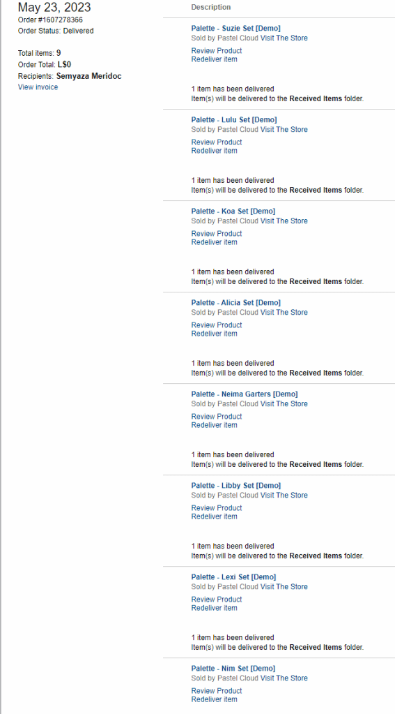 I don’t know about everyone else but that wasn’t a small amount of Linden dollars to spend either. Plus whilst I couldn’t afford to buy more at the time I even grabbed a load of demos a few days later so I could plan my next purchase from her store when I could afford it: