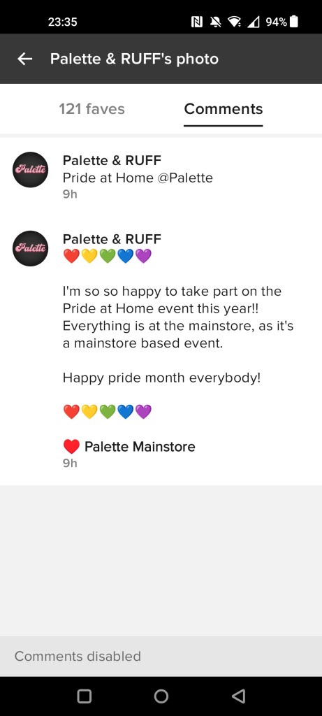 I didn’t even go into specifics; I figured she might reply and ask for examples or let me know that whilst this item couldn’t be rigged for say flat chests or bulge bottoms that in the future she would consider it at least. I didn’t expect to just get blocked. I tried tweeting after I was blocked and didn’t receive an answer so the next day I contacted one of the people who run the Pride at Home event. Emma from Palette says this in her Facebook post: