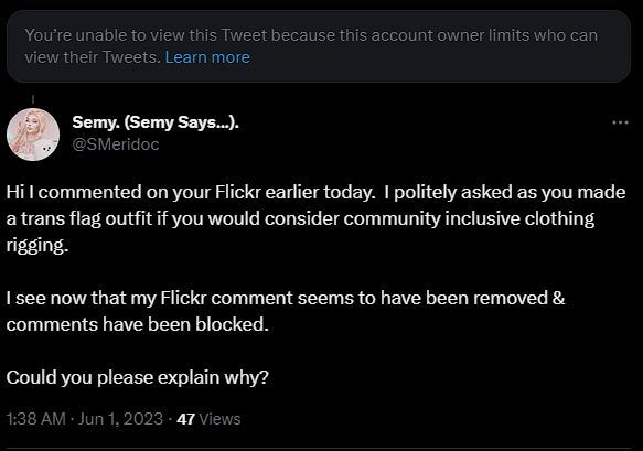Pretty fair question right? Well the owner didn’t agree because they deleted my comment, locked the post so comments couldn’t be made, and blocked me (all my previous Flickr favs from their store vanished from the folder). I considered that a reaction which is either transphobic or at the least a whole situation which displays fake ally-ship.