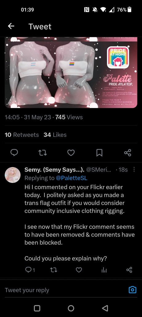 Anyhow Pride has started and for the awesome Pride at Home event loads of creators are making Pride themed items. Yesterday I spotted that one such store is Palette (you will see them at events like Kustom9 every month pretty much) and they created a trans pride flag bikini outfit. It’s cute. Sadly not rigged for many trans avatars in SL though; not one flat chest option for femboys, transmascs, or any folks who don’t have breasts, and no bulge bottom option at all. So after liking the pic on Flickr I politely commented and asked “hi as you have used the trans pride flag would you consider community inclusive rigging?”