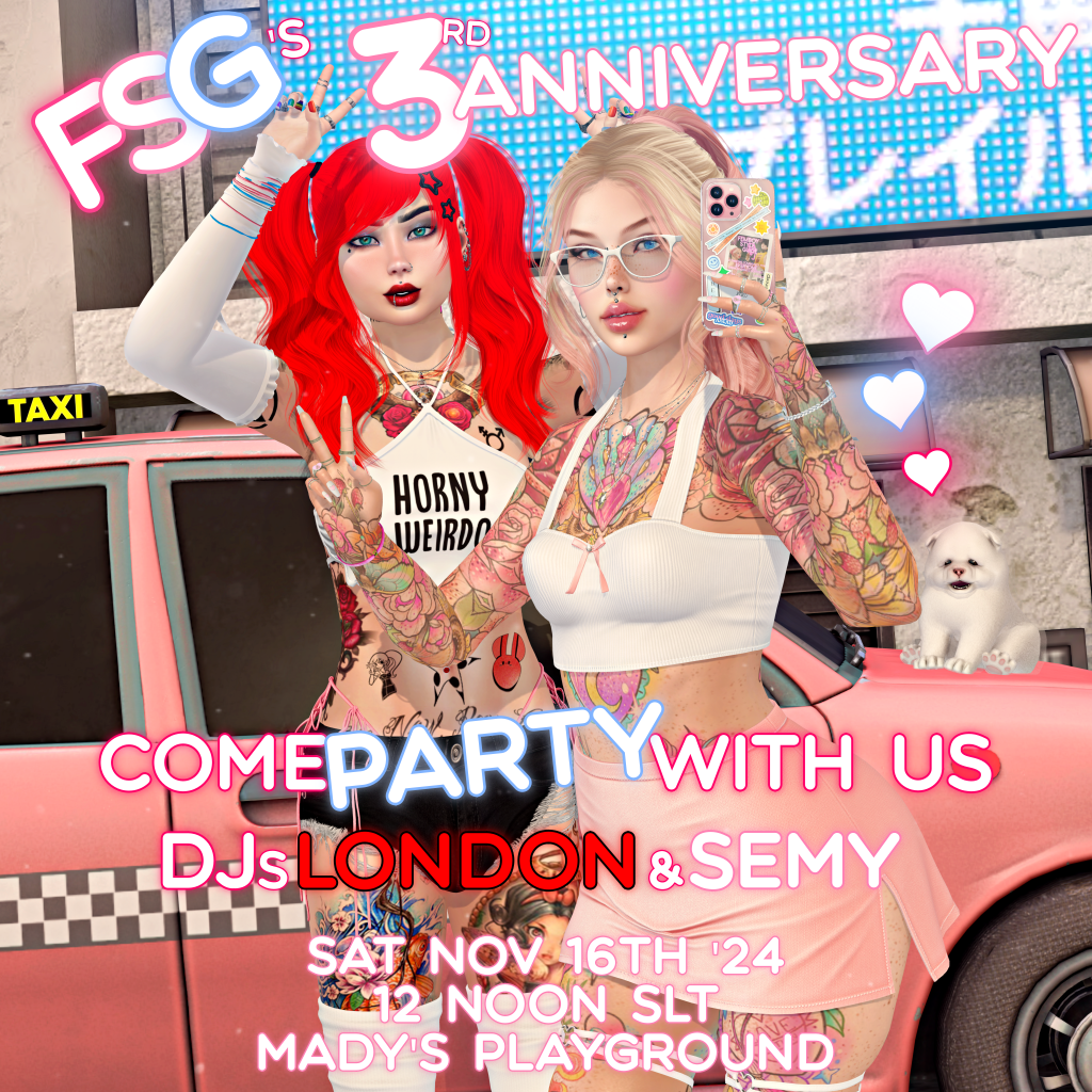 16th of November 12pm SLT – The FSG Third Anniversary party at Mady’s Playground @ FSG with London and I as DJs.