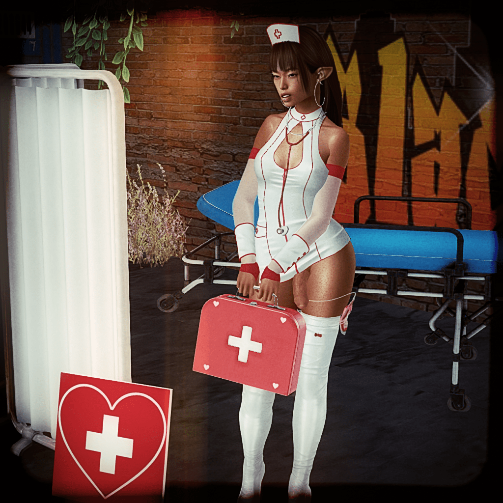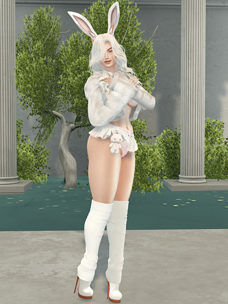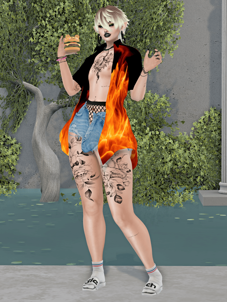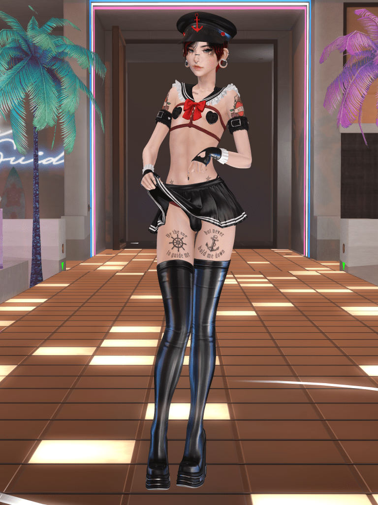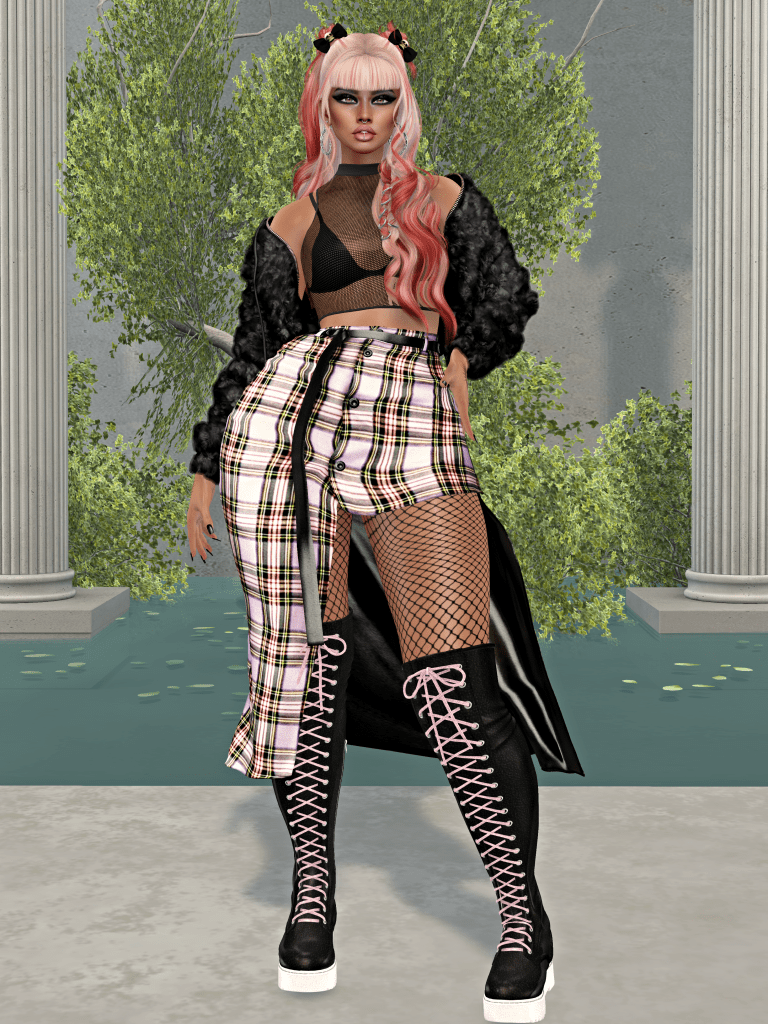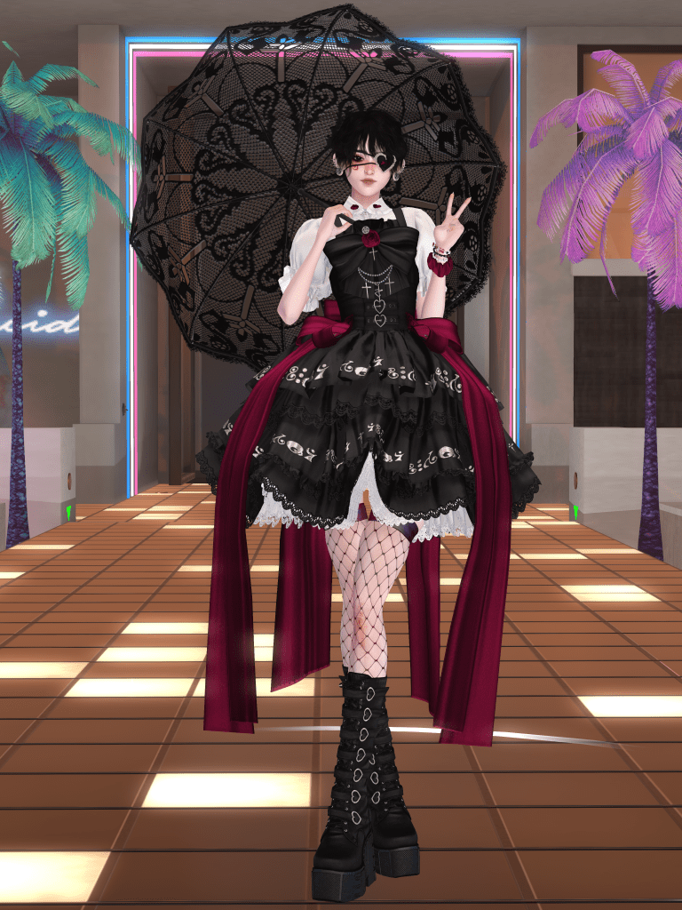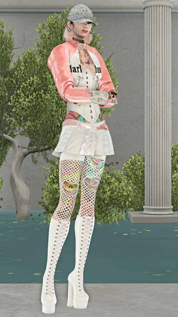 Some love here for minuit with their Momomiya shorts combined with the Magica dress from Rosier -with a disabled chest slider. Jasper also has Woonie boots by Vincue, those classic Sati Fishnets by Lunar, and a heart eye patch from Cheezu.