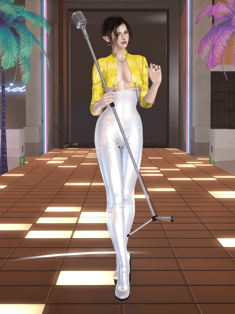 Jun has chosen Jeanne pant boots from Milkbath with the Bunchan Jacket by Crybunbun. They’ve also chosen the Confident necklace from RAWR! and has a Vintage Microphone.