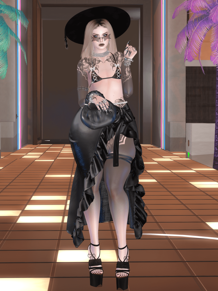 His top is the enkeli gothkini bra and that’s paired with buffy’s siren skirt. Kelis has also sneaked the classic Insanya thong into his ensemble and has yalla heels from Supernatural. Two pairs of sunglasses to finish off the look? Chandra’s salome and Rawr!’s torment sets respectively.