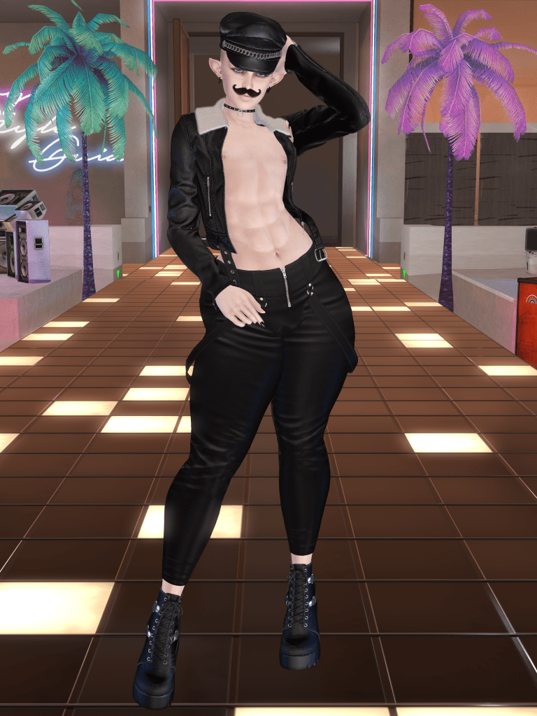 More from CLBlue here as Nero is showing off their suspender pants along with Valentine’s classic Bonnie jacket. We’ve also got Leo boots from Skellybones and a Biker cap from COX.